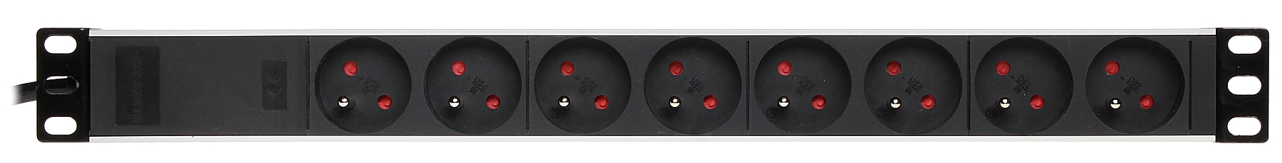 Total maximal current: 16 A ; Maximal total load: 3680 W ; Number of outlets: 8 for universal plug 230 V (DIN 49441) ; Length of the power cable: 2 m - cable with power connector IEC320 C14 ; Housing type: 1 U RACK 19" ;
